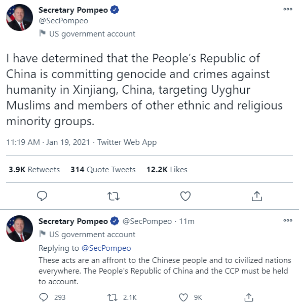 60 "I have determined that the People’s Republic of China is committing genocide and crimes against humanity in Xinjiang, China, targeting Uyghur Muslims and members of other ethnic and religious minority groups." - Secretary, Mike Pompeo (i.postimg.cc) posted 4 years ago by Transfer 4 years ago by Transfer +60 / -0 12 comments share 12 comments share save hide report block hide replies
