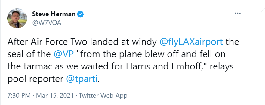 After Air Force Two landed at windy @flyLAXairport to seal of the @VP "from the plane blew off and fell on the tarmac as we waited for Harris and Emhoff," relays pool reporter @tparti.