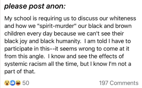 Get your kids OUT: NYC public schools are telling white teachers that they "spirit murder" their Black and Brown students (pbs.twimg.com)