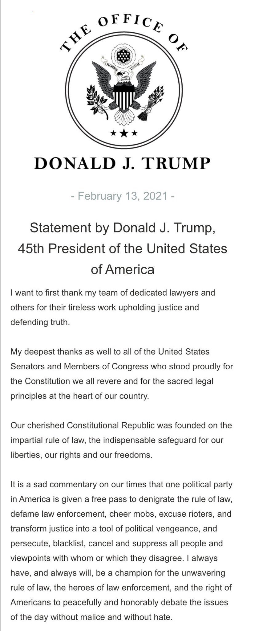 42 Trump Issues Statement Following Acquittal: "I always have, and always will, be a champion for the unwavering rule of law, the heroes of law enforcement, and the right of Americans to peacefully and honorably debate the issues of the day without malice and without hate." (pbs.twimg.com) posted 4 years ago by axolotl_peyotl 4 years ago by axolotl_peyotl +43 / -1 13 comments share 13 comments share save hide report block hide replies
