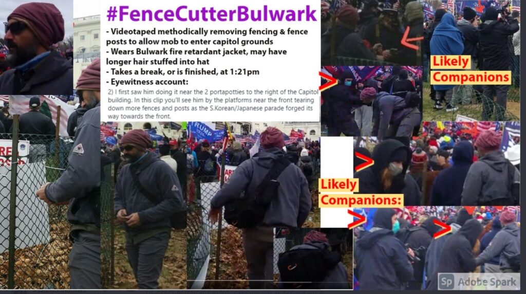 Despite the FBI’s lack of interest in this brazen booby-trapper seen rolling up restricted area fencing, online researchers have stayed on the case. They have dubbed this individual “#FenceCutterBulwark”, with “Bulwark” being the brand name of his fire-retardant jacket, designed for professional use in the oil and gas industry. You’ll see more fire-retardant jackets among the unindicted below.