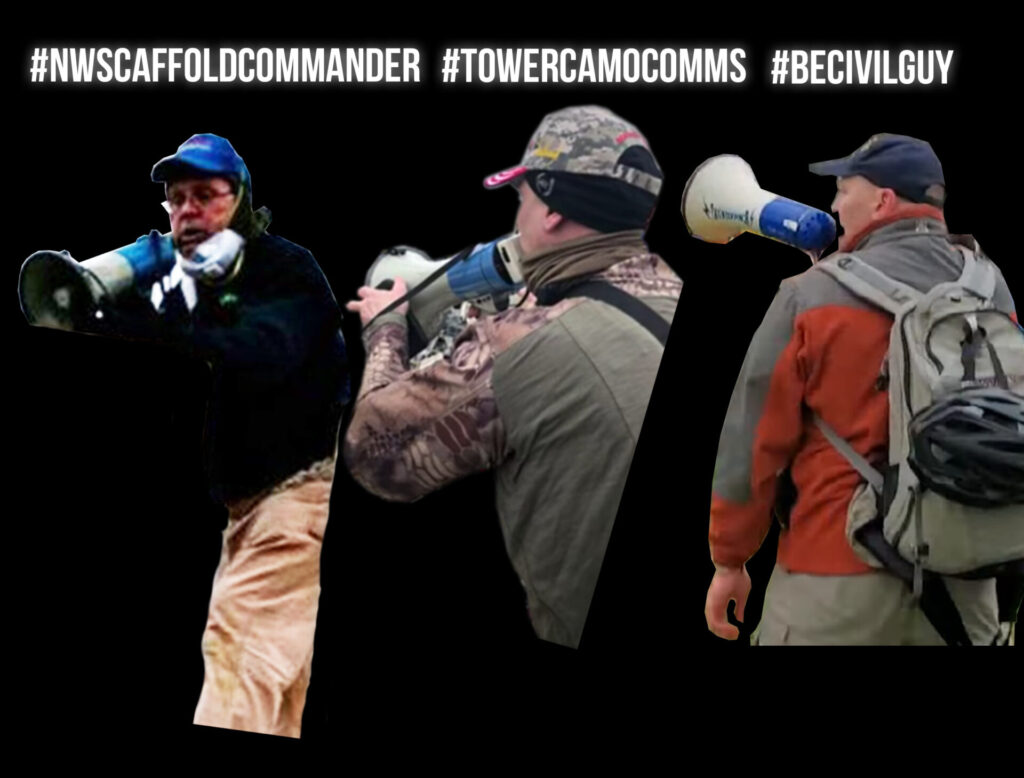 From high atop the tower between 1 p.m. – 2:30 p.m, ScaffoldCommander issued the iconic bellows and non-stop commands that are loud and clear on almost every video clip from January 6 filmed in that time interval. For nearly 90 minutes straight, he bombards the otherwise leaderless crowd below him with endless variations on a single instruction: “Don’t just stand there. Keep moving forward!”