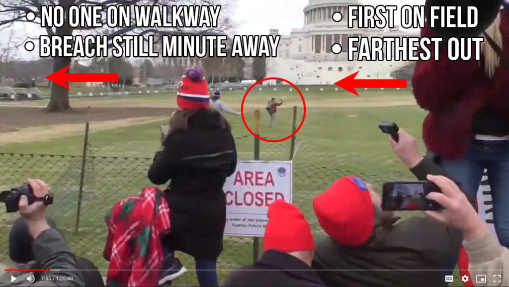 But there’s a big problem with that theory: BeCivilGuy was the first guy who broke upfield toward the second police line, way past the “Restricted Area” fencing — and he did so before Ray Epps & Co. breached the first police line at 12:50 p.m., and before any fencing came down from the efforts of BlackSkiMask and his team.