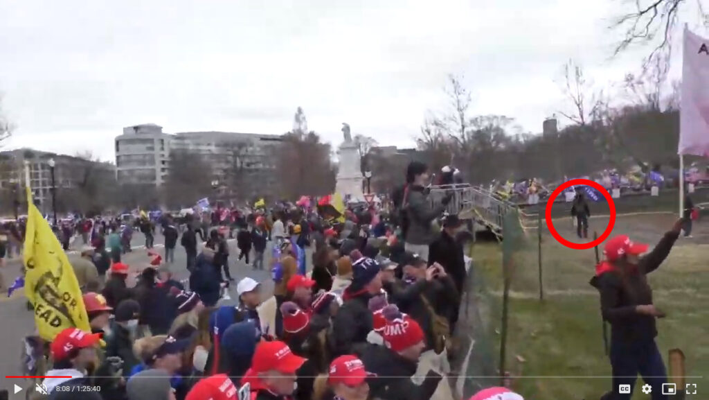 At this point the clock read 1:03 p.m., so there were still 7 minutes left in Trump’s rally speech. Yet already, an enormous and growing crowd filled the horizon. That crowd was headed toward the very spot where Ray Epps is standing. Epps pointed back proudly to where Trump was speaking and beamed with a broad smile.