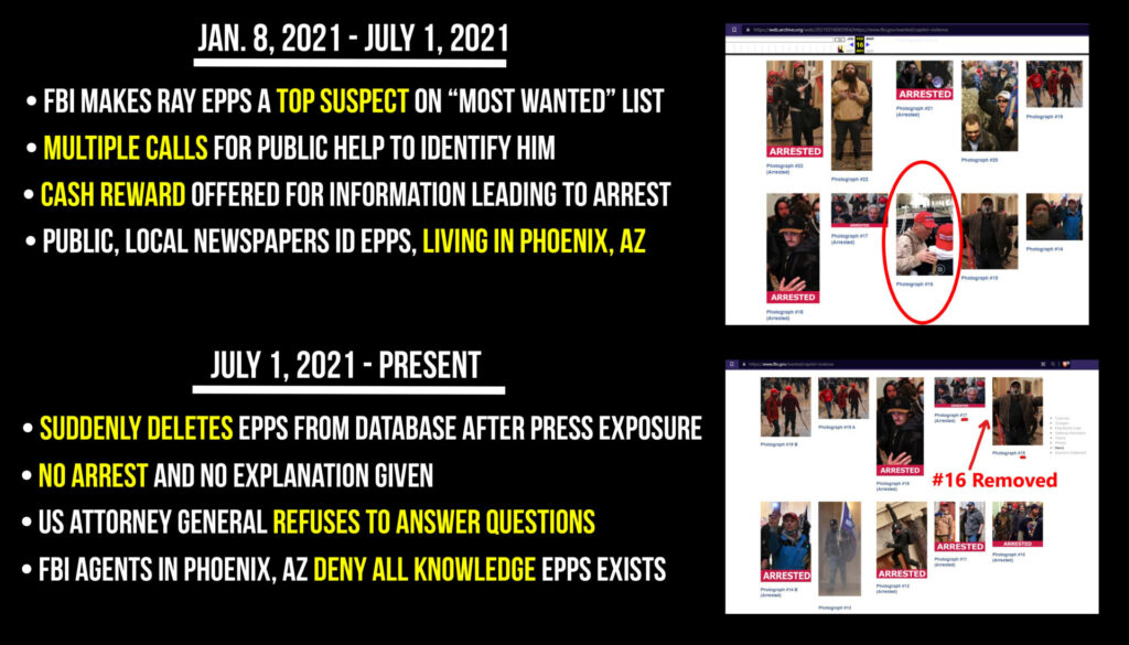 As we explained in detail in our previous report, the FBI originally put Ray Epps’s face on its Capitol Violence “Most Wanted List” on January 8, 2021, just two days after 1/6. They offered a cash reward for information leading to his arrest. In fact, rank-and-file FBI agents initially deemed Epps’s role as an apparent riot organizer so important that they named him Suspect #16—one of the first 20 high-profile FBI targets in a database now packed with more than 500 suspects.
