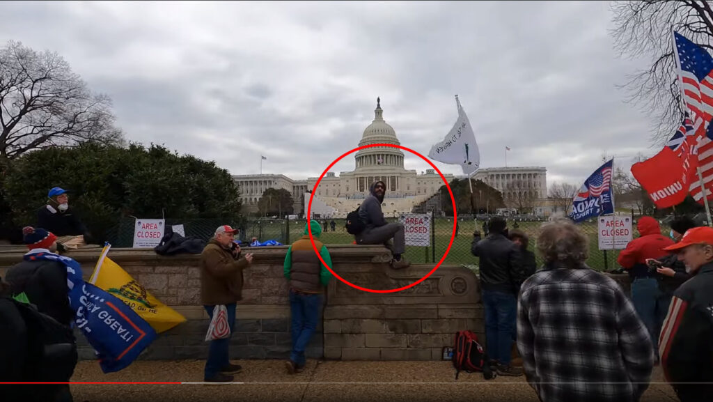 At the 0:35 mark, Epps is practically underneath the command tower, just arms-length away. You can see from Ray Epps’s point of view just how close he is to the front of the Capitol building itself, where he has staked out a key position.
