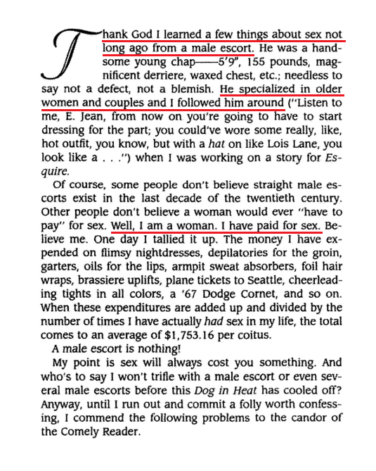 Well in the snippet she starts off by saying she pays for hookers or male escorts.