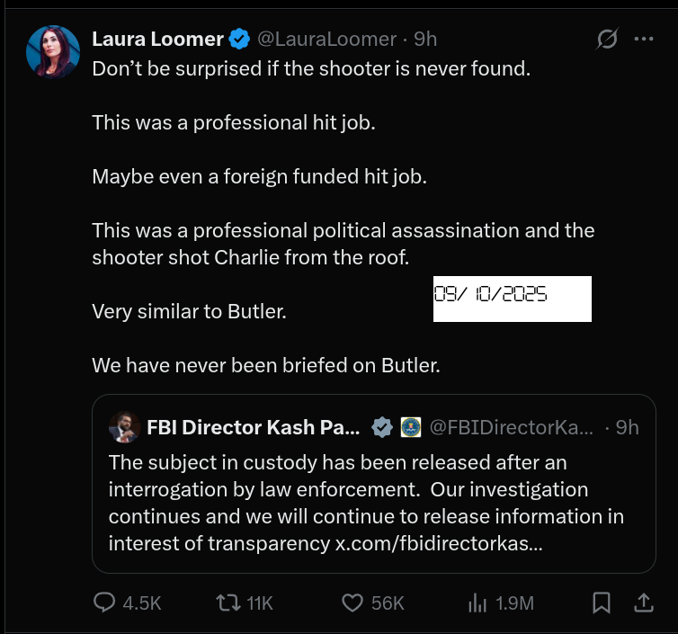 "Don't be surprised if the shooter is never found." Many believe Laura Loomer to be a MOSSAD intelligence asset; if so then this message may have a double meaning. It may be more of a "We are in control and you will NOT find the shooter".
