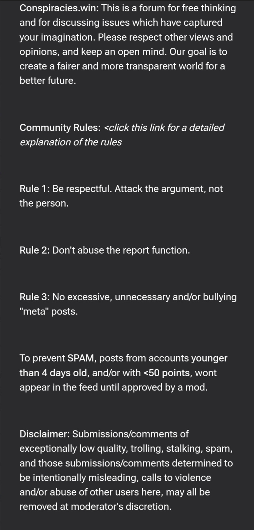 The link to the Conspiracies rules has the same as the sidebar, so that's all we've got to work with. A purpose, 3 rules, and a disclaimer.