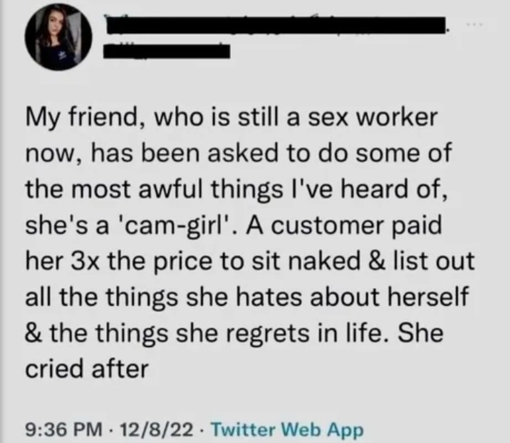 Sex workers (whores) aren't even human, so I don't care what they regret.
