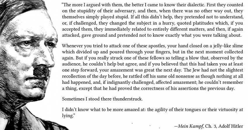Everyone should read Mein Kampf. Hitler was incredibly logical and merely wanted the jews out of his country because they were perverting and demoralizing the populace, as they had done in Russia for hundreds of years. He talks about how arguing with the jews involves them lying and feigning lack of knowledge, and virtually "resetting" their positions daily without any regard for what happened the day before, like robots. Very dishonest people, and have been for a long long time. They'd had MILLENNIA to shape up, and here they are, manipulating, genociding, and owning everything of importance, just like 1000 years ago. When will WE learn? They never will. When will WE?