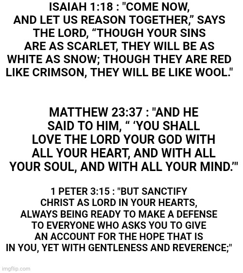 Isaiah 1:18 : "Come now, and let us reason together,” Says the LORD, “Though your sins are as scarlet, They will be as white as snow; Though they are red like crimson, They will be like wool."