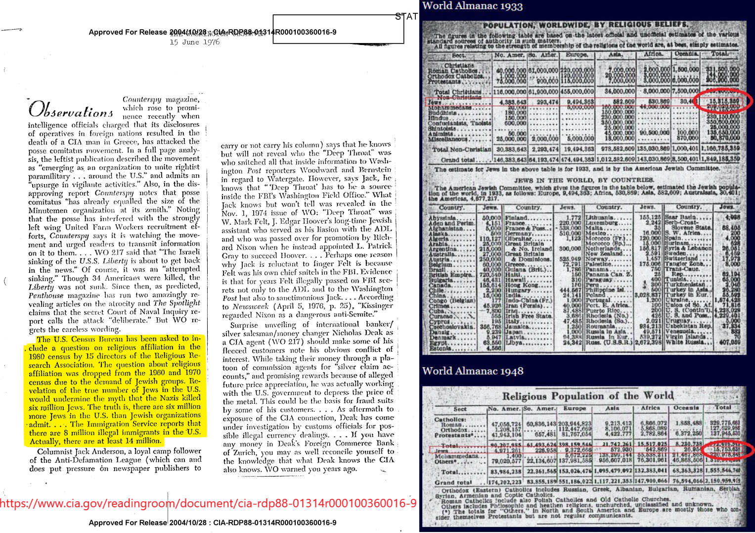 Counterspy magazine states that jewish numbers were removed from the World Almanac due to pressure from jewish interest groups, as the data showed that 6 million couldn't have died: