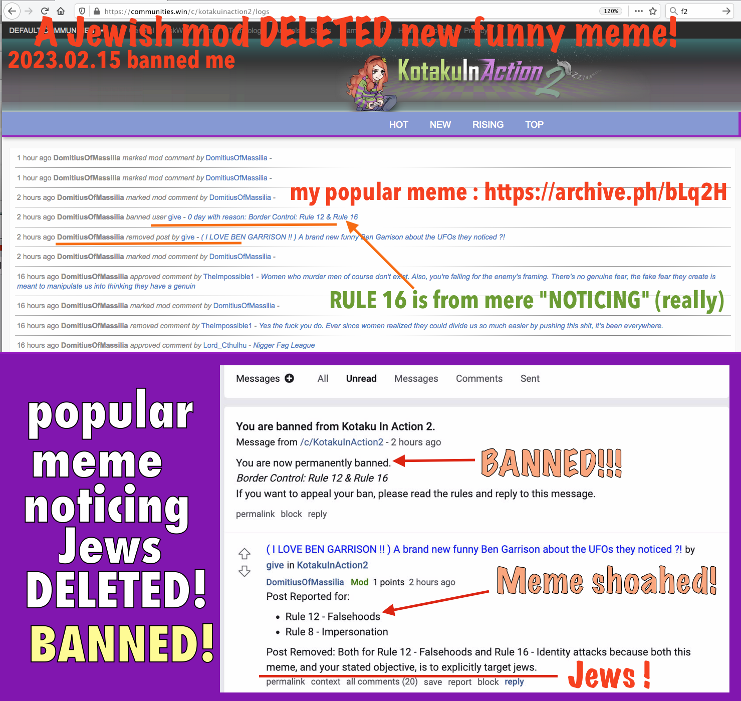 A week ago a Jewish mod permabanned me for a tame new funny meme that merely NOTICED JEWS! PERMABAN !: