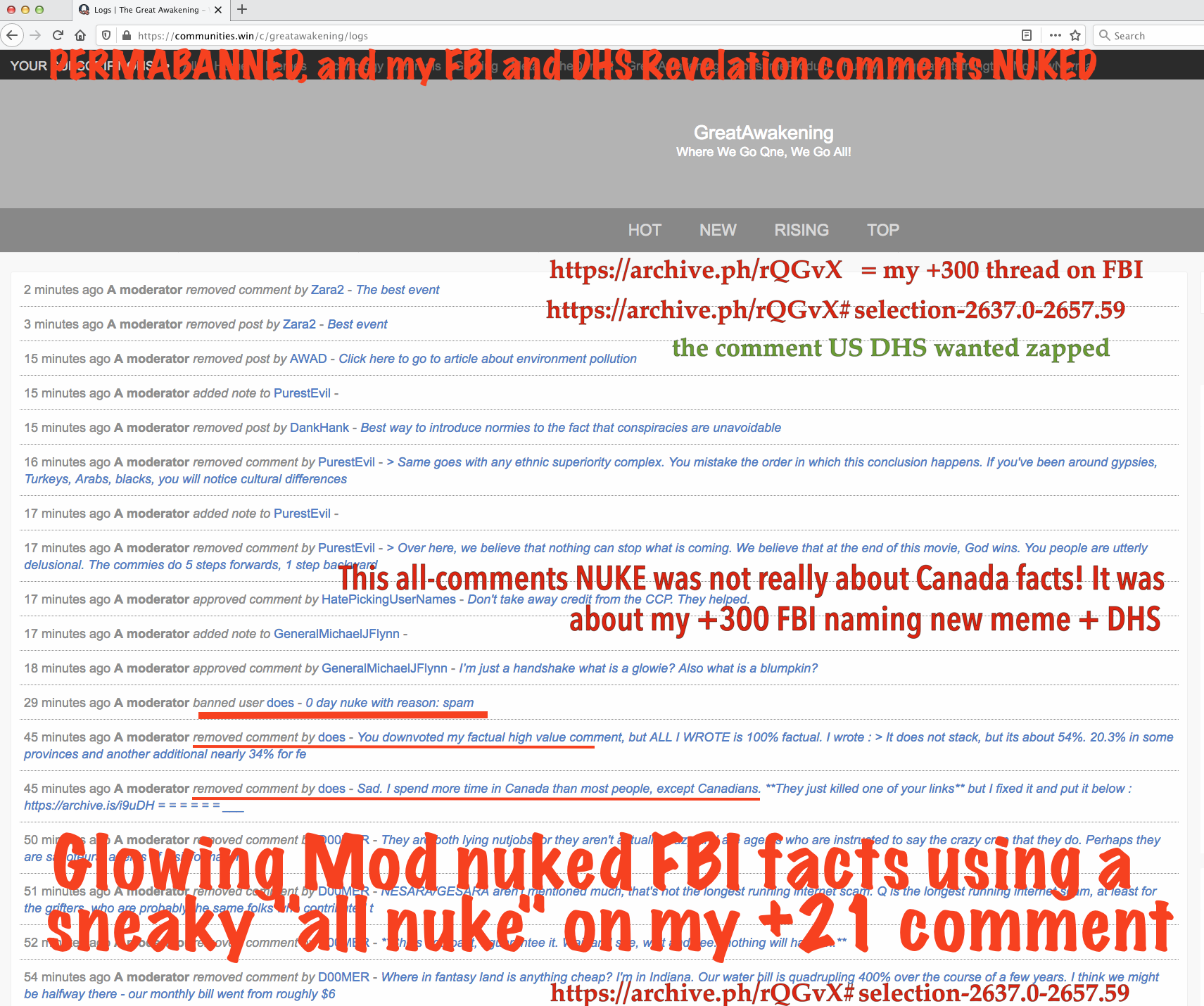 I got a comment removed recently by c/GreatAwakening mod in the following timeline.