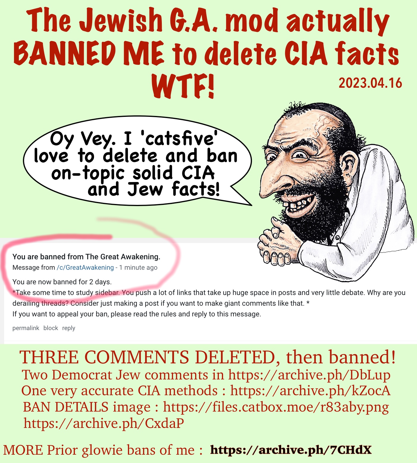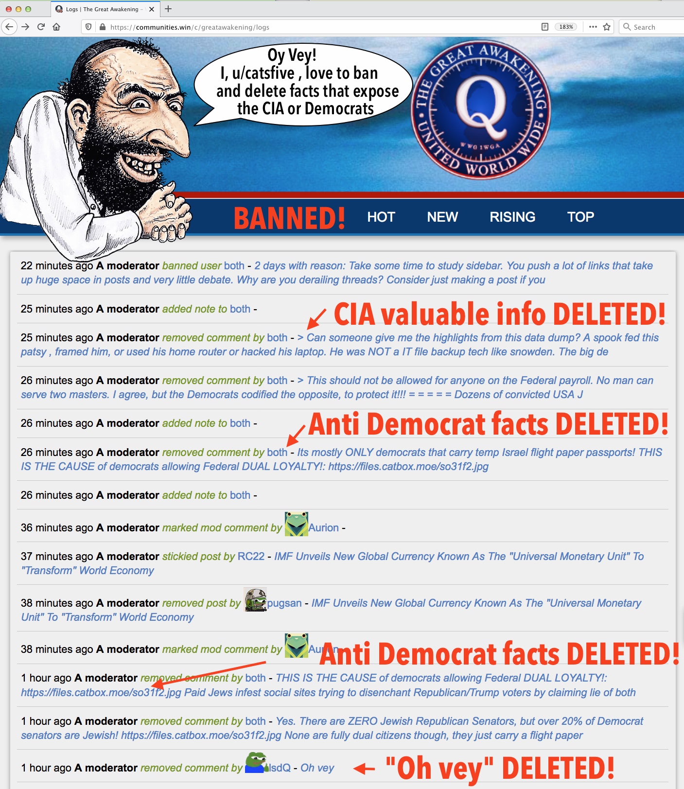🚨🚨📢 DANGER!! The Jewish Mod of c/GreatAwakening , catsfive BANNED ME and suspiciously deleted a VALUABLE CIA comment, and 2 valuable Democrat Jew comments! My proof shoahed and deleted, and BANNED again. If I support 2nd amendment gun rights, or expose Ukrainian war crimes I got banned too! 🚨🚨