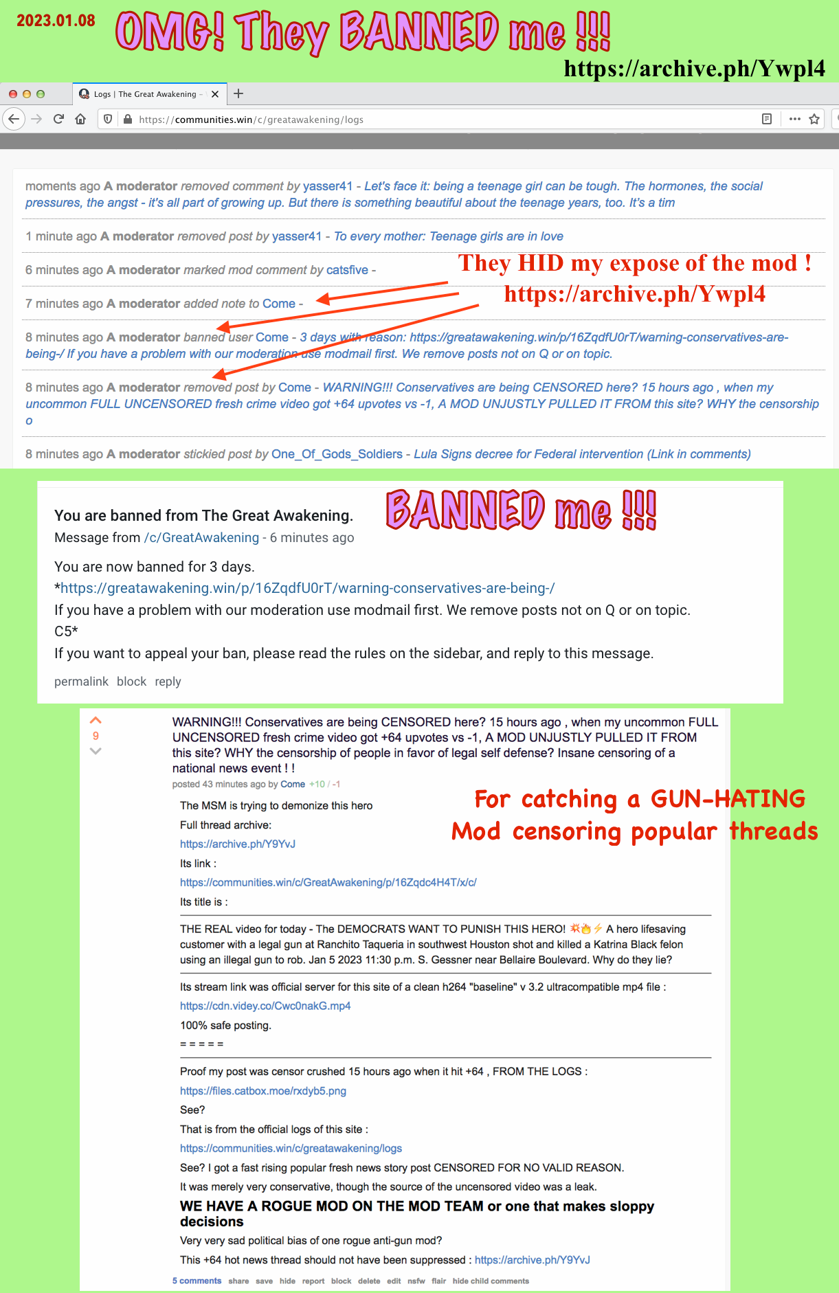They just banned me! MORE OF SCORED is SUBVERTED by Leftist Mods?! A Corrupt Gun-hating mod at c/GreatAwakening just BANNED ME for outing them, then hid the post thread!