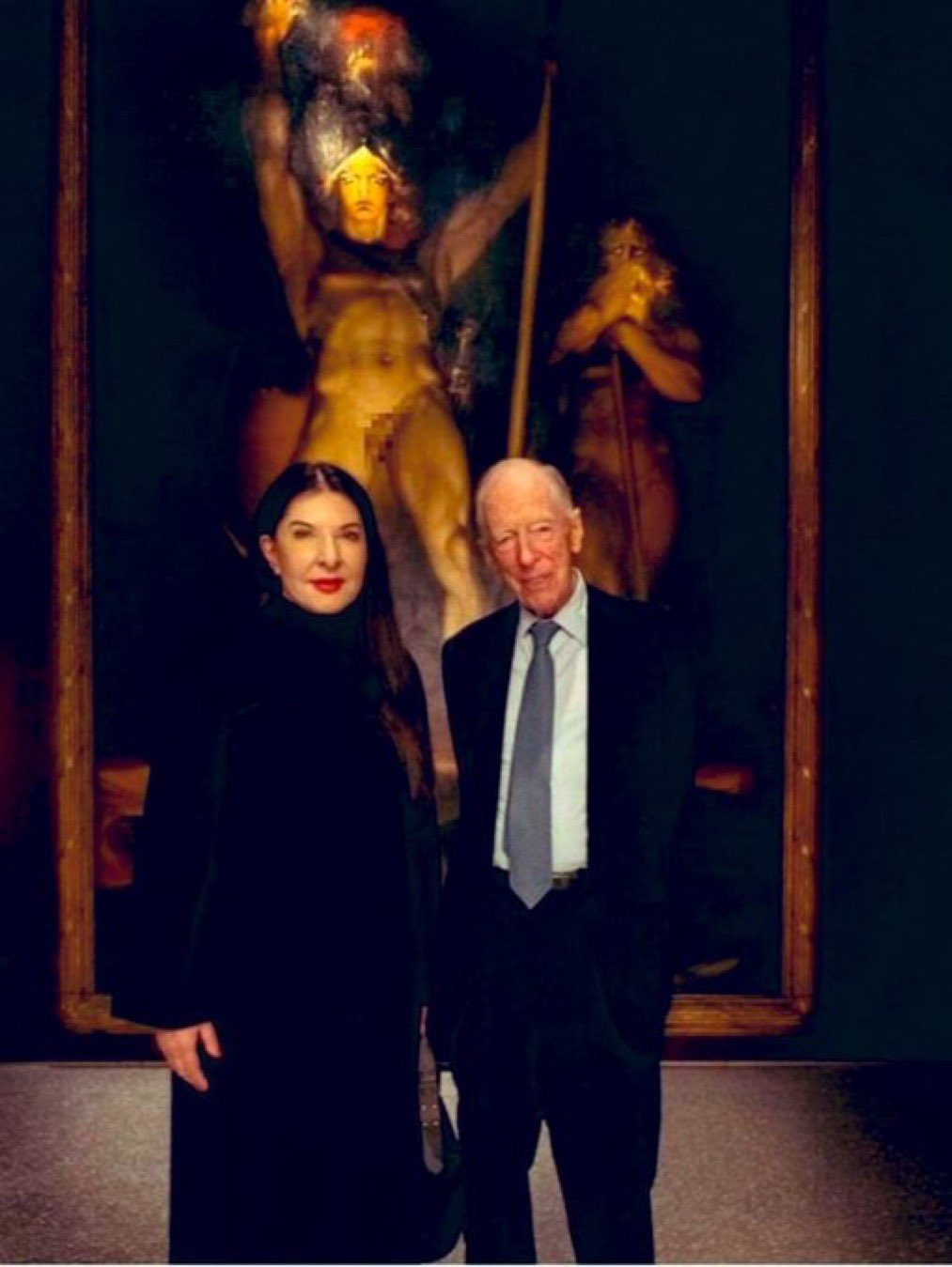 "Occultist Marina Abramovic posing with Jacob Rothschild in front of the painting: "Satan summoning his Legions" (1767-1983) "