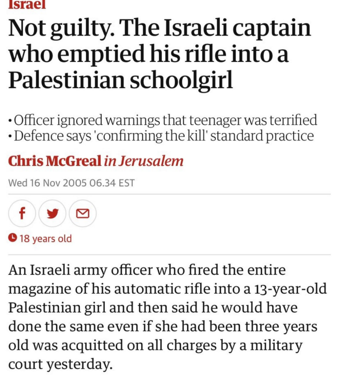 idf soldier empties entire magazine into schoolgirl; says he would do it again; acquitted [the guardian]: