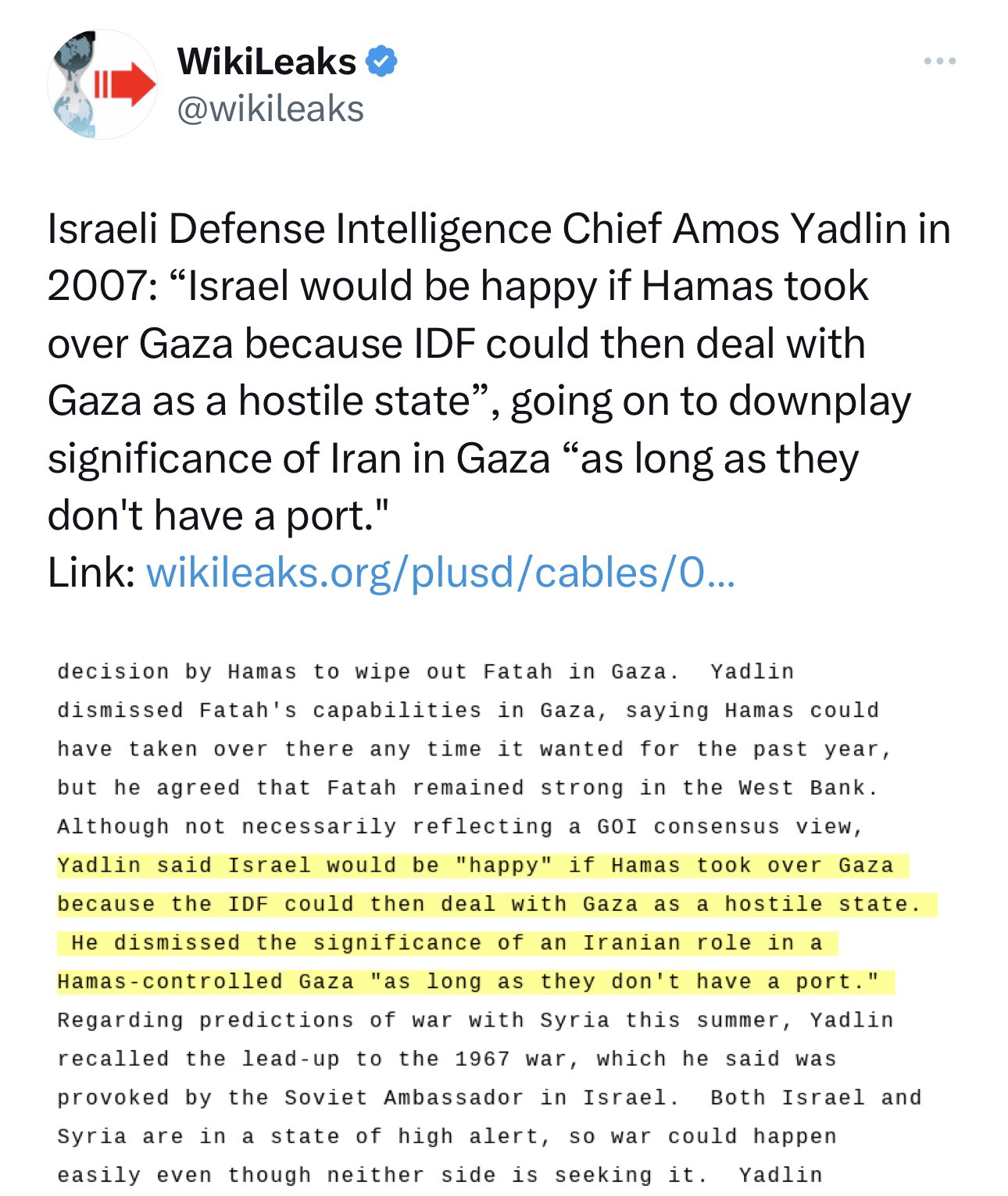 israel wanted hamas in gaza so they could treat it as an occupied state: